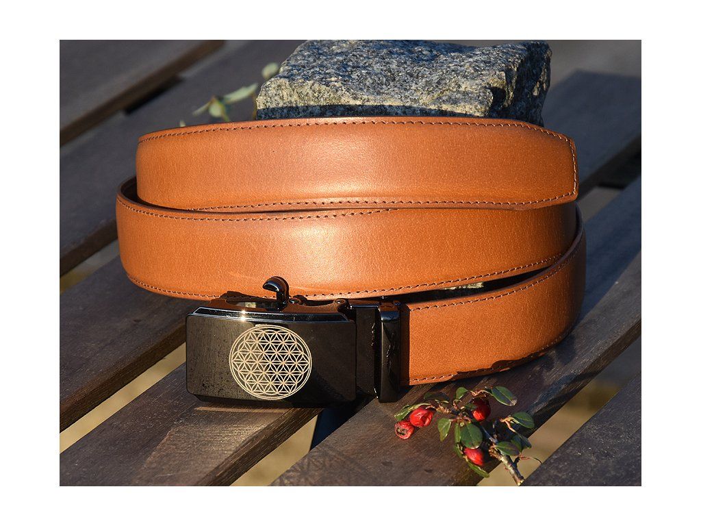 Kožený pásek s vygravírovaným motivem na automatické přezce. Vhodný i ke společenskému obleku, uniformě. Tento opasek nemá dírky - spona AUTOMAT se zapíná speciálním mechanismem, délku pásku lze jednoduše zkrátit u zaklapovací spony.