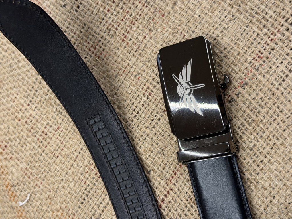 Kožený pásek s vygravírovaným motivem na přezce. Vhodný i ke společenskému obleku, uniformě.