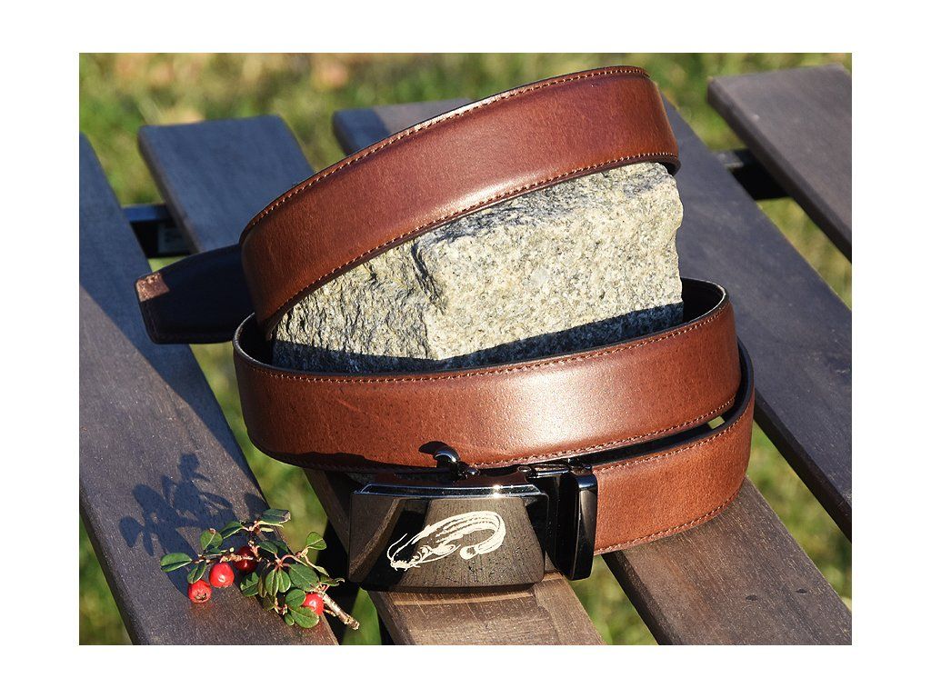 Kožený pásek s vygravírovaným motivem na automatické přezce. Vhodný i ke společenskému obleku, uniformě. Tento opasek nemá dírky - spona AUTOMAT se zapíná speciálním mechanismem, délku pásku lze jednoduše zkrátit u zaklapovací spony.