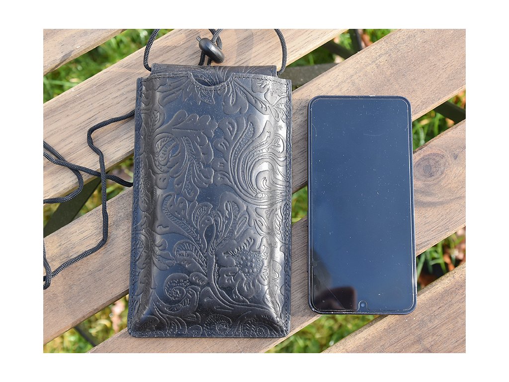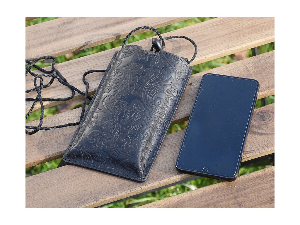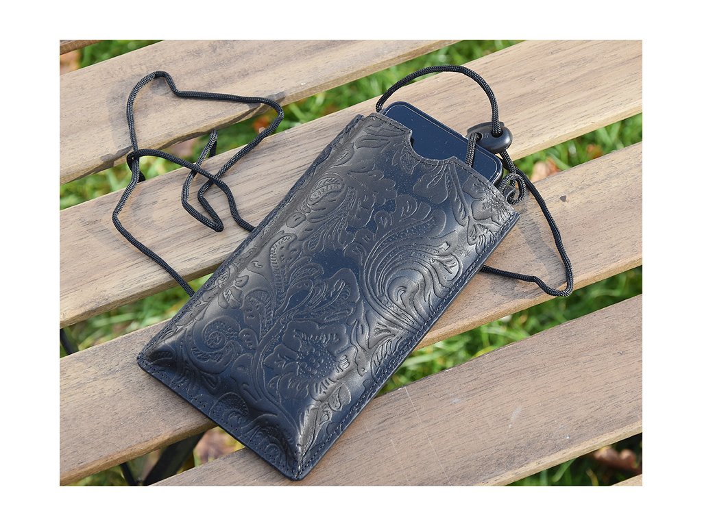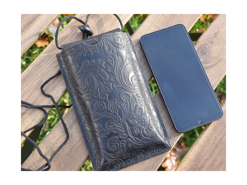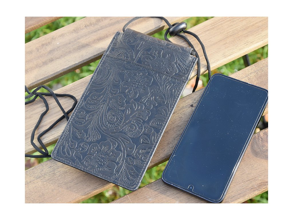 Kožená kapsa na mobil se šňůrkou přes rameno s praktickou kapsičkou vzadu.