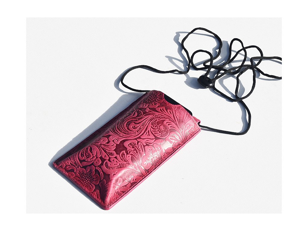 Kožená kapsa na mobil se šňůrkou přes rameno s praktickou kapsičkou vzadu.