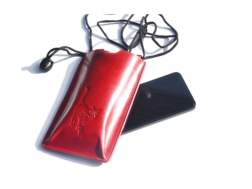 Kožená kapsa na mobil se šňůrkou přes rameno s praktickou kapsičkou vzadu.