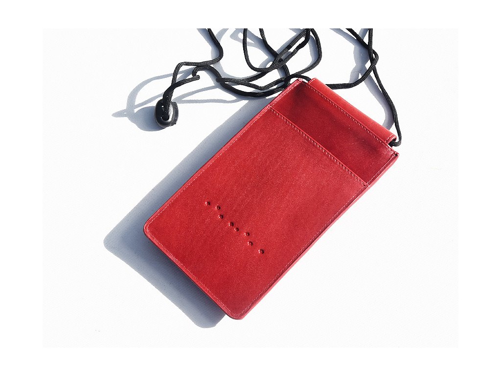 Kožená kapsa na mobil se šňůrkou přes rameno s praktickou kapsičkou vzadu.