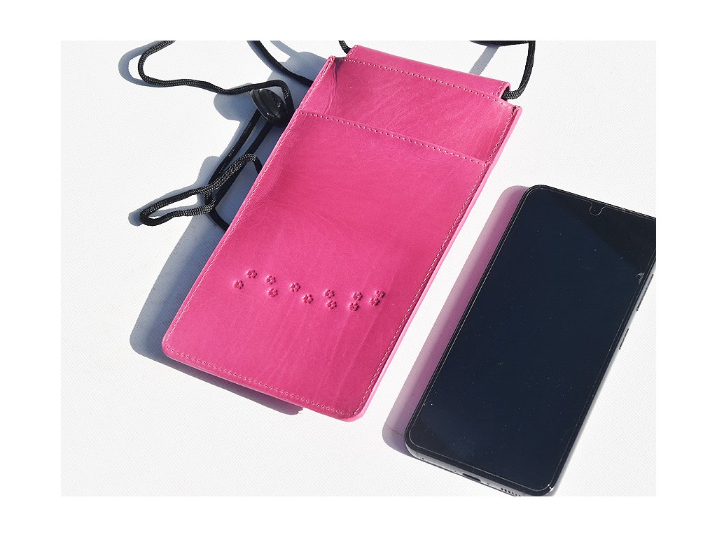 Kožená kapsa na mobil se šňůrkou přes rameno s praktickou kapsičkou vzadu.